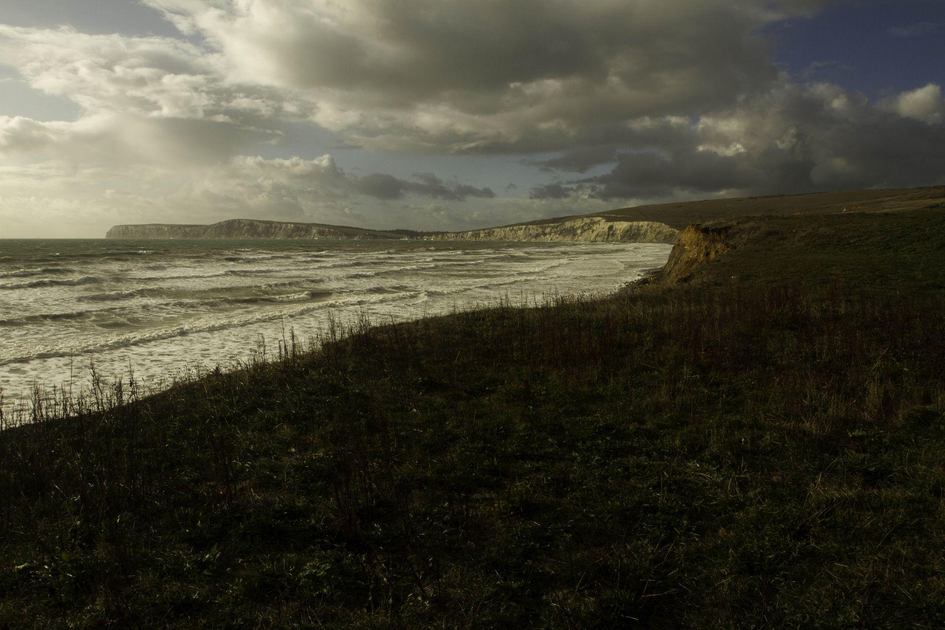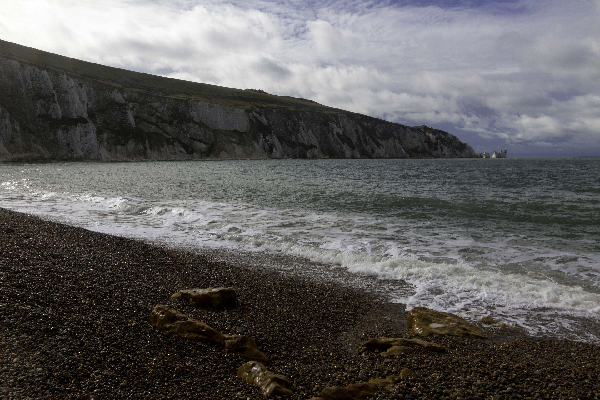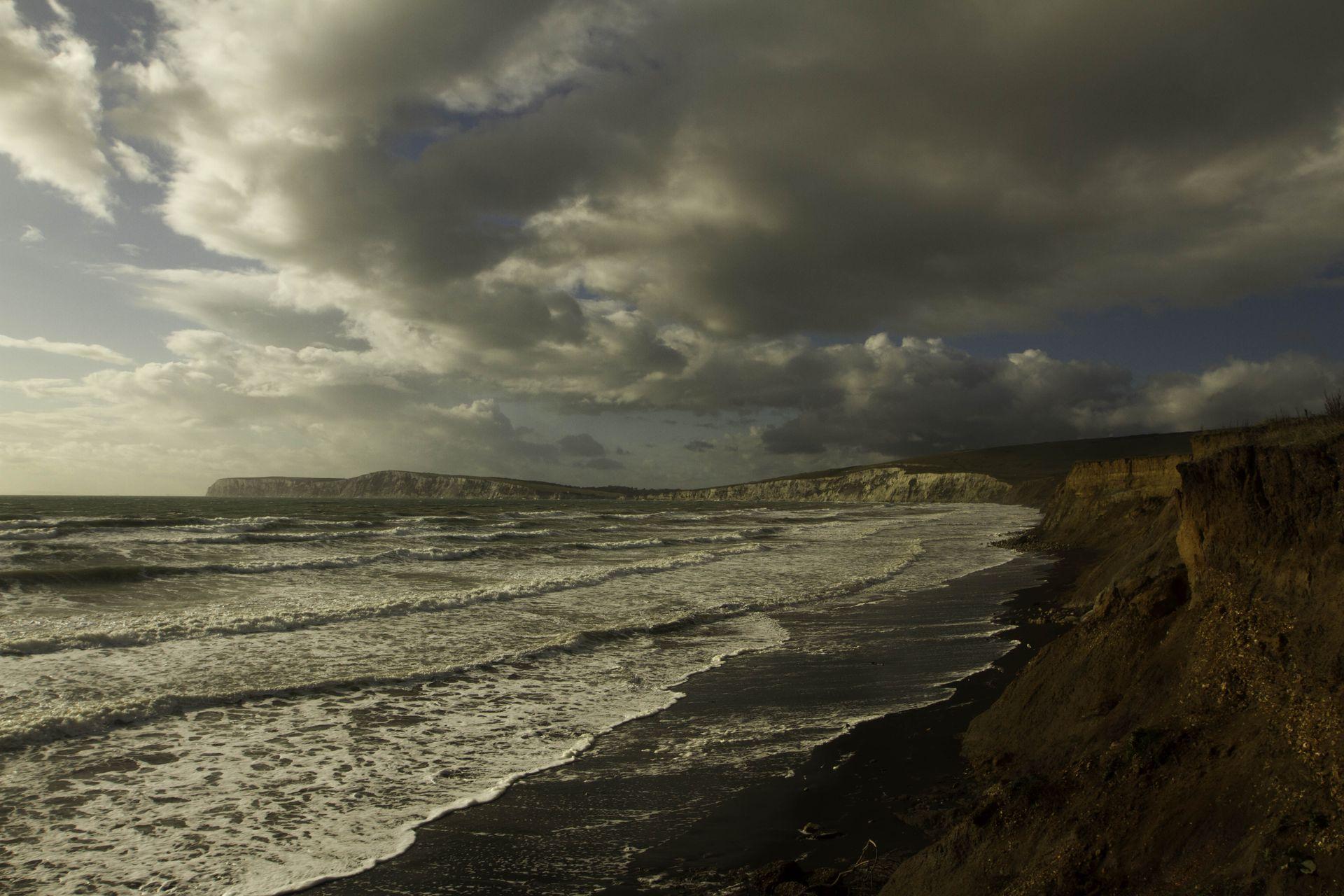 The views along the coast from Compton Beach are rather lovely, as the surf laps against the cliffs.