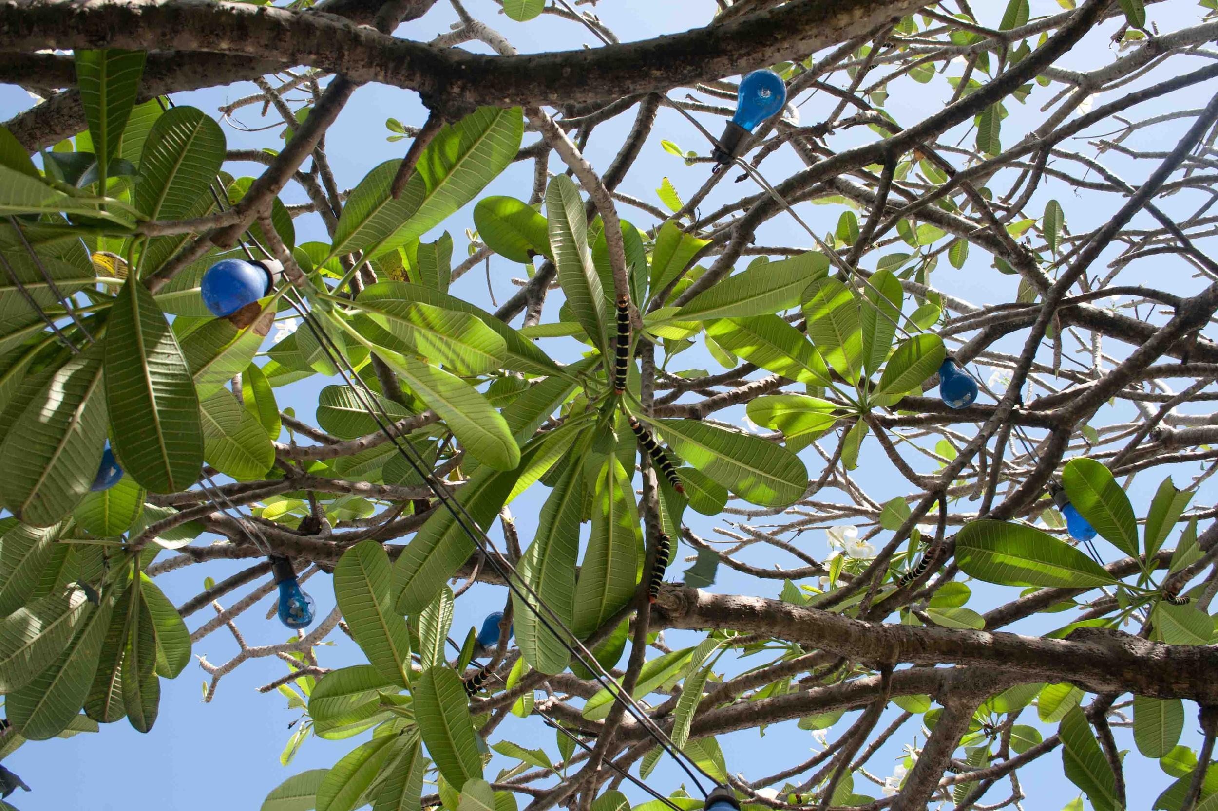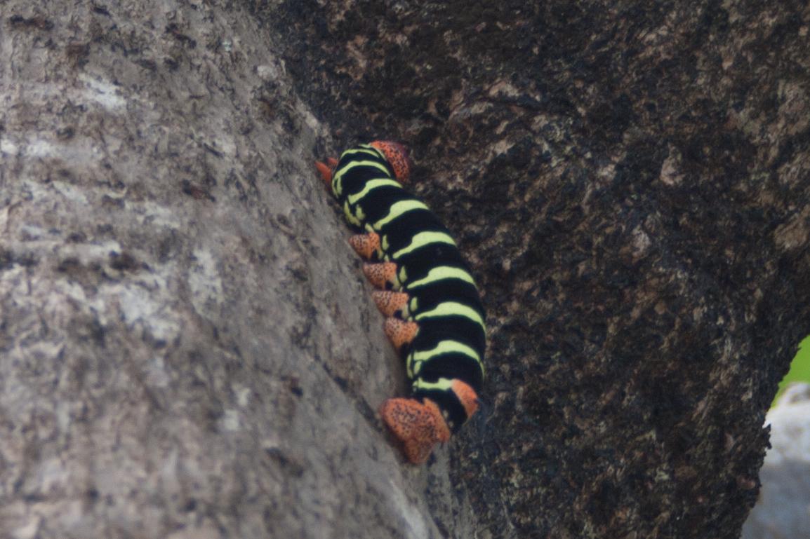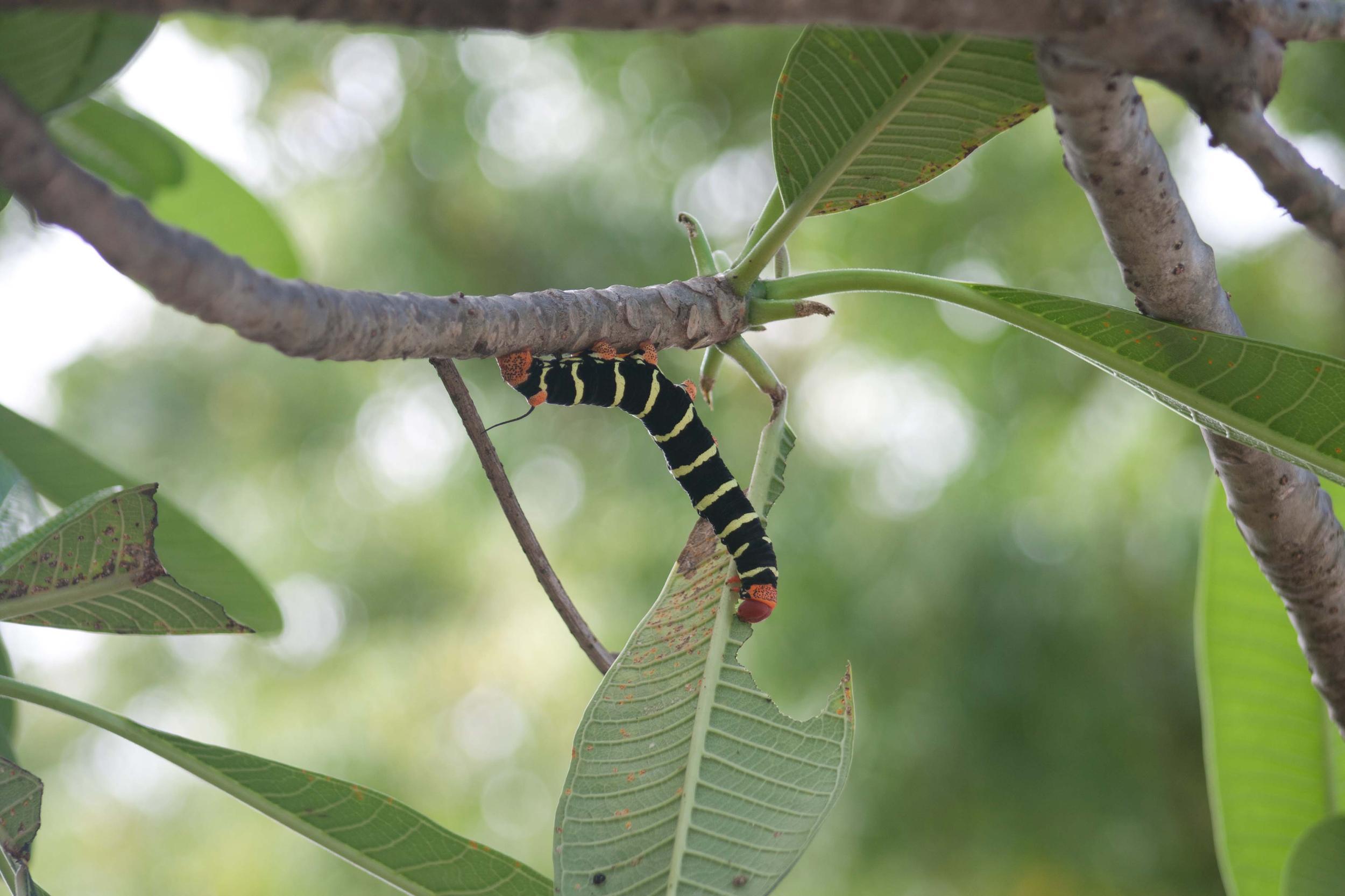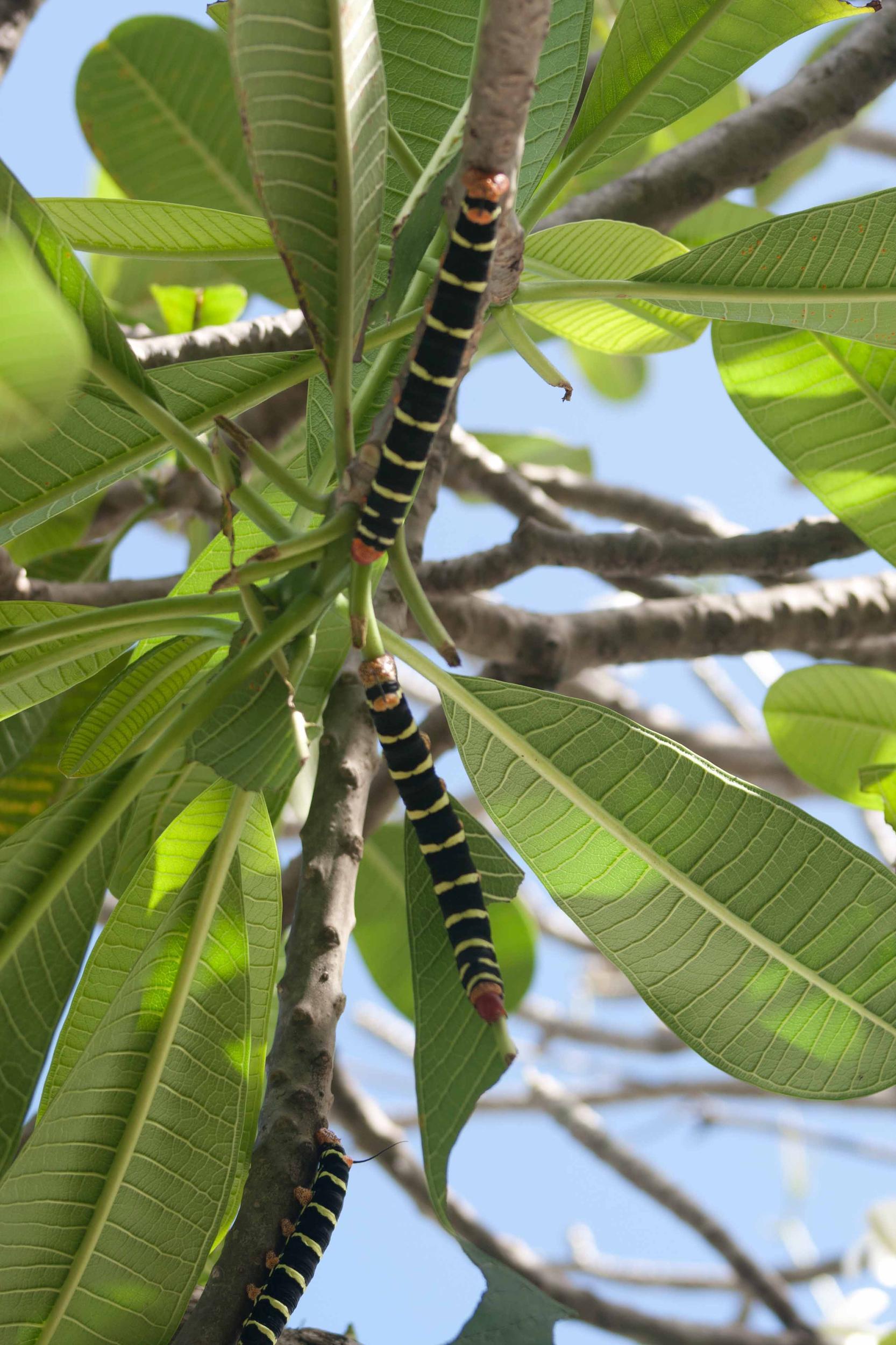 Whilst wandering through town, a local pointed out to me that a white frangipani tree had become infested with frangipani caterpillars. He sucked his teeth in the Bajan manner as he told me that the tree would be destroyed soon as a consequence. The caterpillars were quite large (4 inches / 10 centimetres or more) and could be seen all over the tree munching on the leaves.