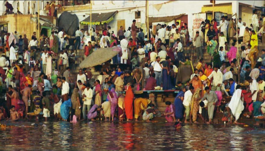 The River Ganges at Varanasi is a particularly important pilgrimage site for Hindus and is where many are taken to be cremated at the water side (photo 1) and then have their ashes thrown in to the river. Just next to this people are ritually bathing and washing clothes in the 'holy' water (photos 2 & 3).