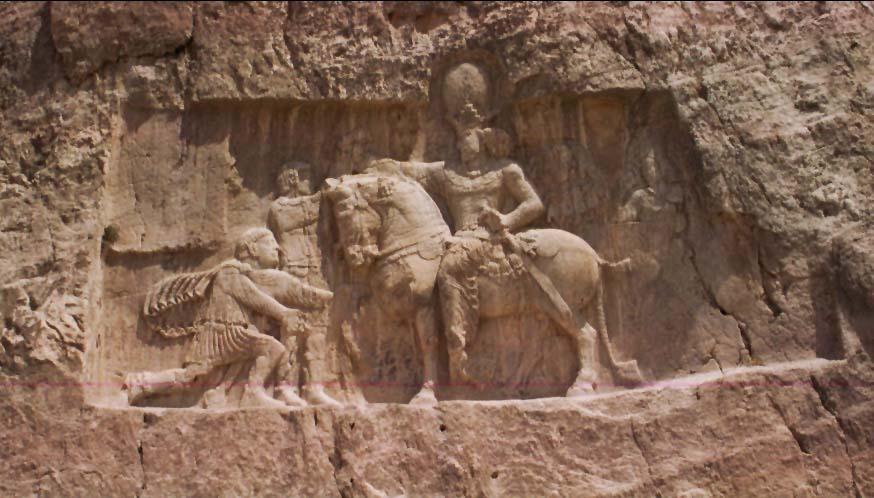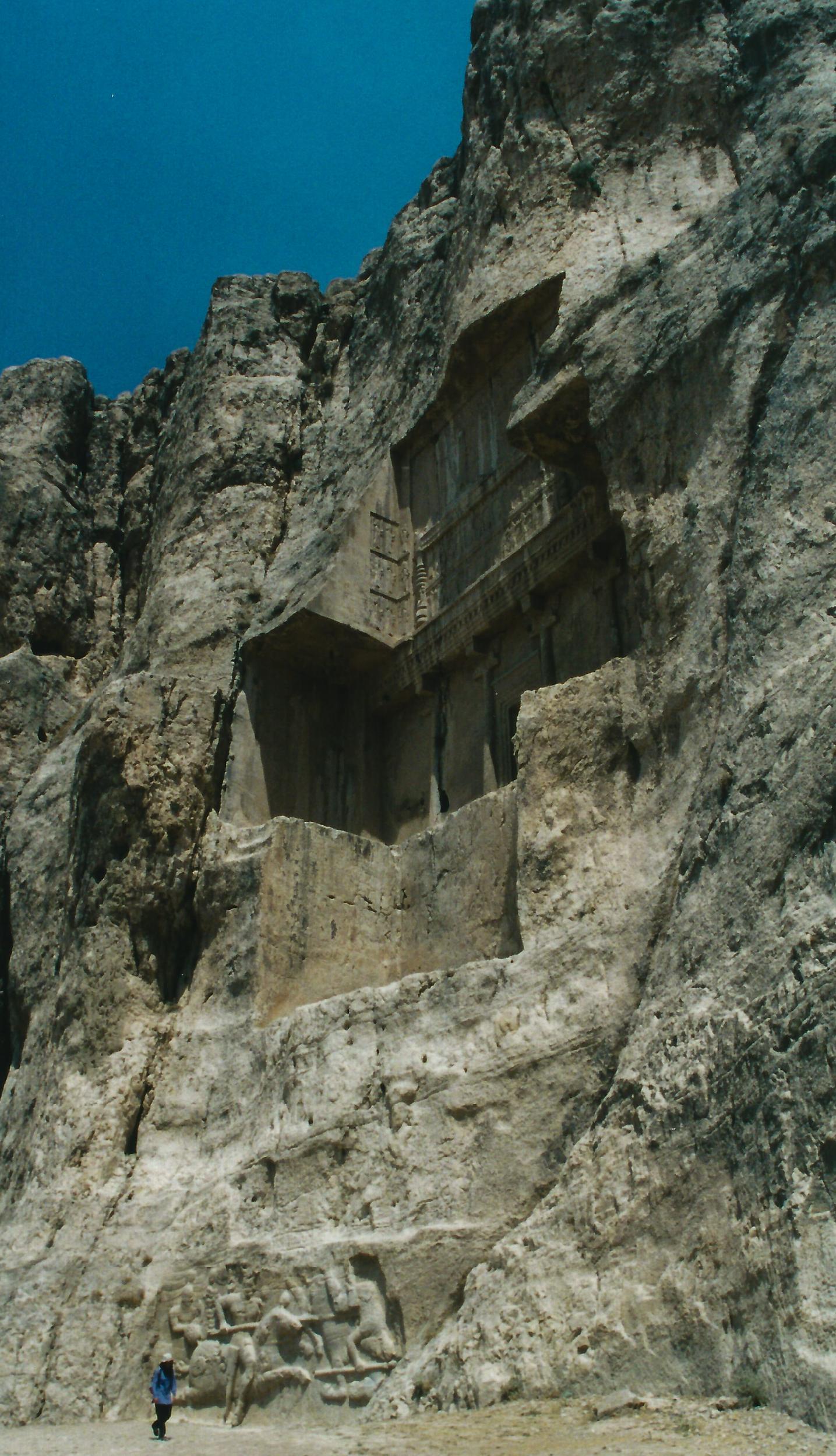 Not far from Persepolis are the tombs of several former Persian rulers, generally called either Xerxes or Ataxerxes. The detail of the rock carving in the pictures below do not give any scale. In fact this detail is several metres high and larger than life, carved directly into the cliff face. Next to these tombs is a Zoroastrian fire temple, shown in the fourth and fifth pictures.