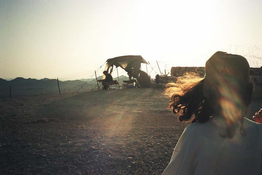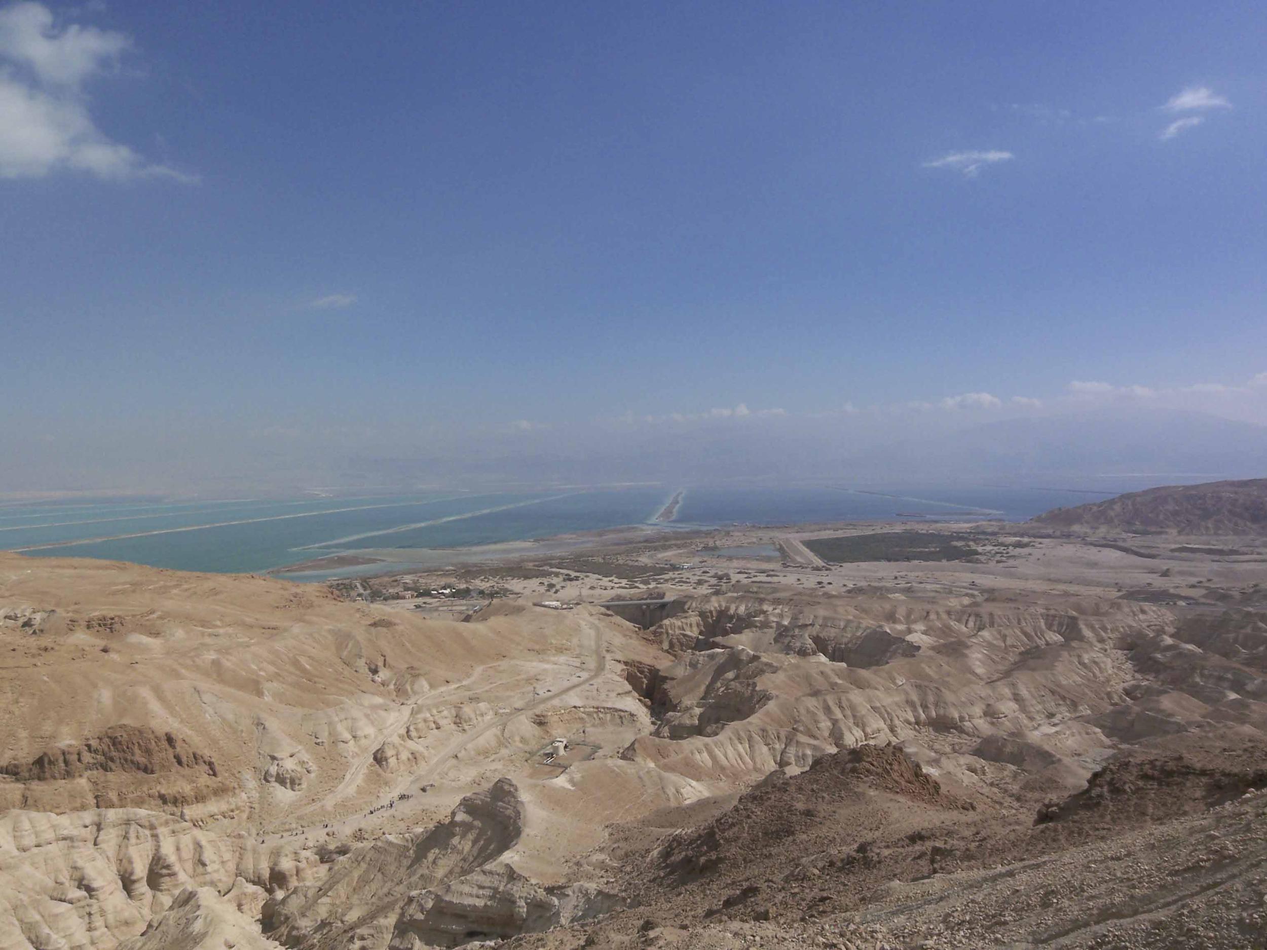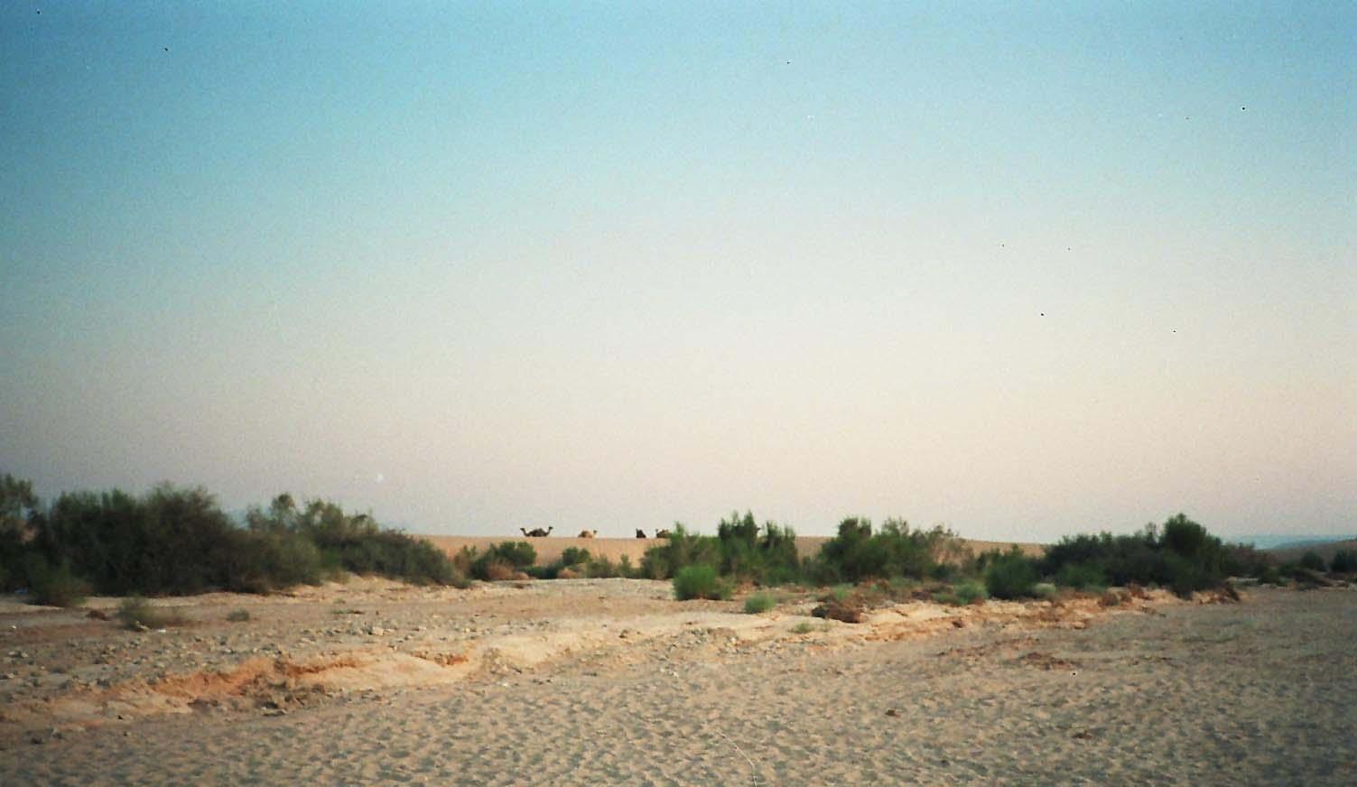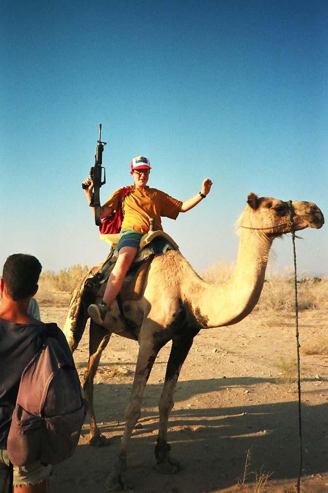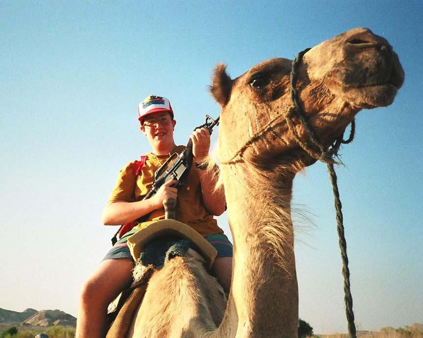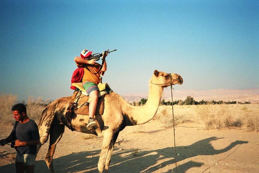 In the Negev desert can be found several interesting things. Firstly, Bedouins (invariably performing for the tourists) making the traditional coffee ceremonies. The Dead Sea, the world's lowest point on the surface. Famous for being extremely salt rich, so anyone can float. Be warned though not a good place too bathe if you have open sores or grazes, although it will clean them, they will sting like hell. Then there is Ein Gedi an oasis just next to the Dead Sea, where there are some nice waterfalls and Ibex can be found. Also if you are lucky you will come across a sixteen year old Englishman wielding an M-16 whilst riding a camel. Or perhaps come across the same person riding a little donkey up a mountain.