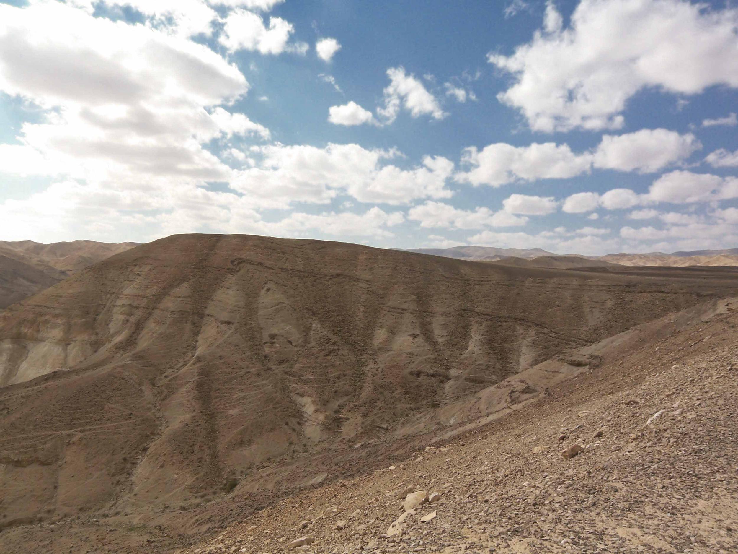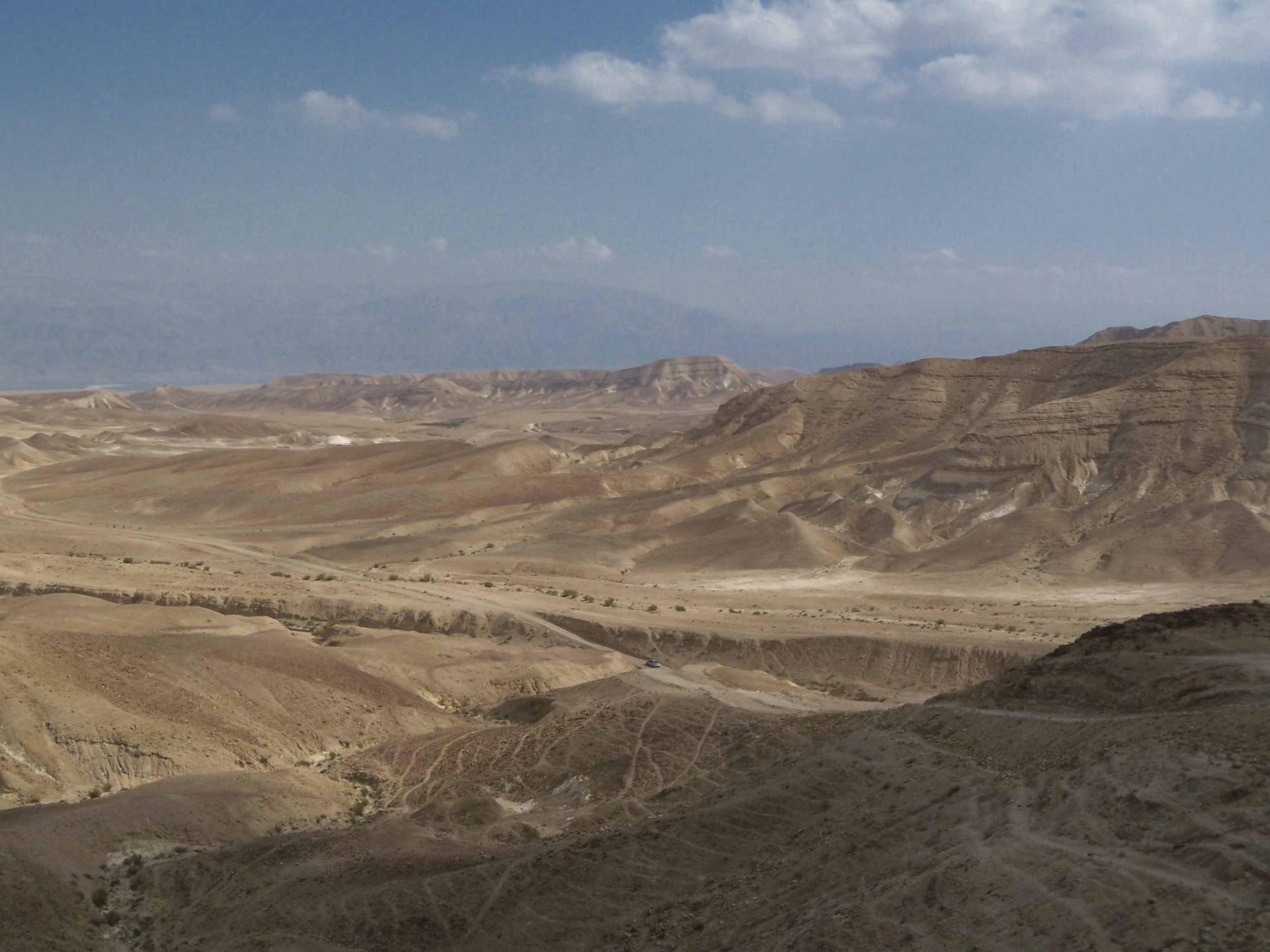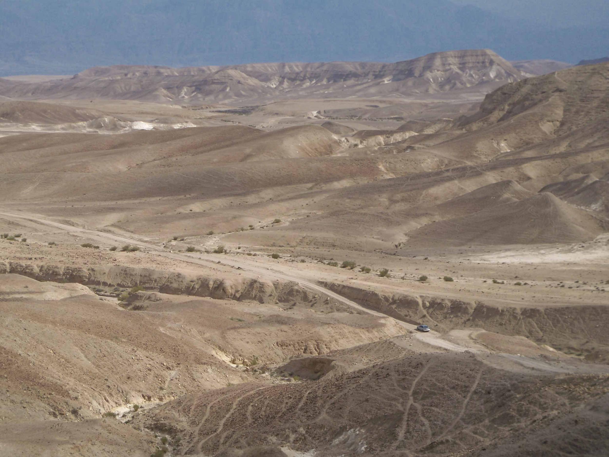 On the way back from Eilat, we decided to visit Masada, an ancient Herodian fortress. It was used by some Jews as a stronghold during the Jewish Revolt in the first century C.E. I hadn't been for sixteen years, since my first visit to the country. On the road north, I woke and asked my co-pilot whereabouts the turning was for Masada, as we had been along the side of the Dead Sea for a while now. She checked the map and told me I'd missed it, so we turned around and then drove towards Arad. There was only one sign for Masada, which said 4x4. We looked further along the road, but to no avail. There were busloads of kids walking from the start of the 4x4 road we had seen. I made the executive decision to try that road, after all how far can it be if the kids are walking there? The most important point in our favour was our car - it was a rental./n/n . /n/n After negotiating some pretty bumpy tracks and some downright dangerous bits we found ourselves stuck on a precipitous loose shale road, not able to climb higher. I managed to slowly back the car down and turn it around. We then went for a walk to see where we were and the views were excellent. It transpired on the way back, at the fork in the road we had travelled along and decided to keep left, there is an Israeli sign that means 'Take this turning'. Something my Israeli companion forgot to mention at the time. In photos 2&3, you can see the car in the middle of nowhere.