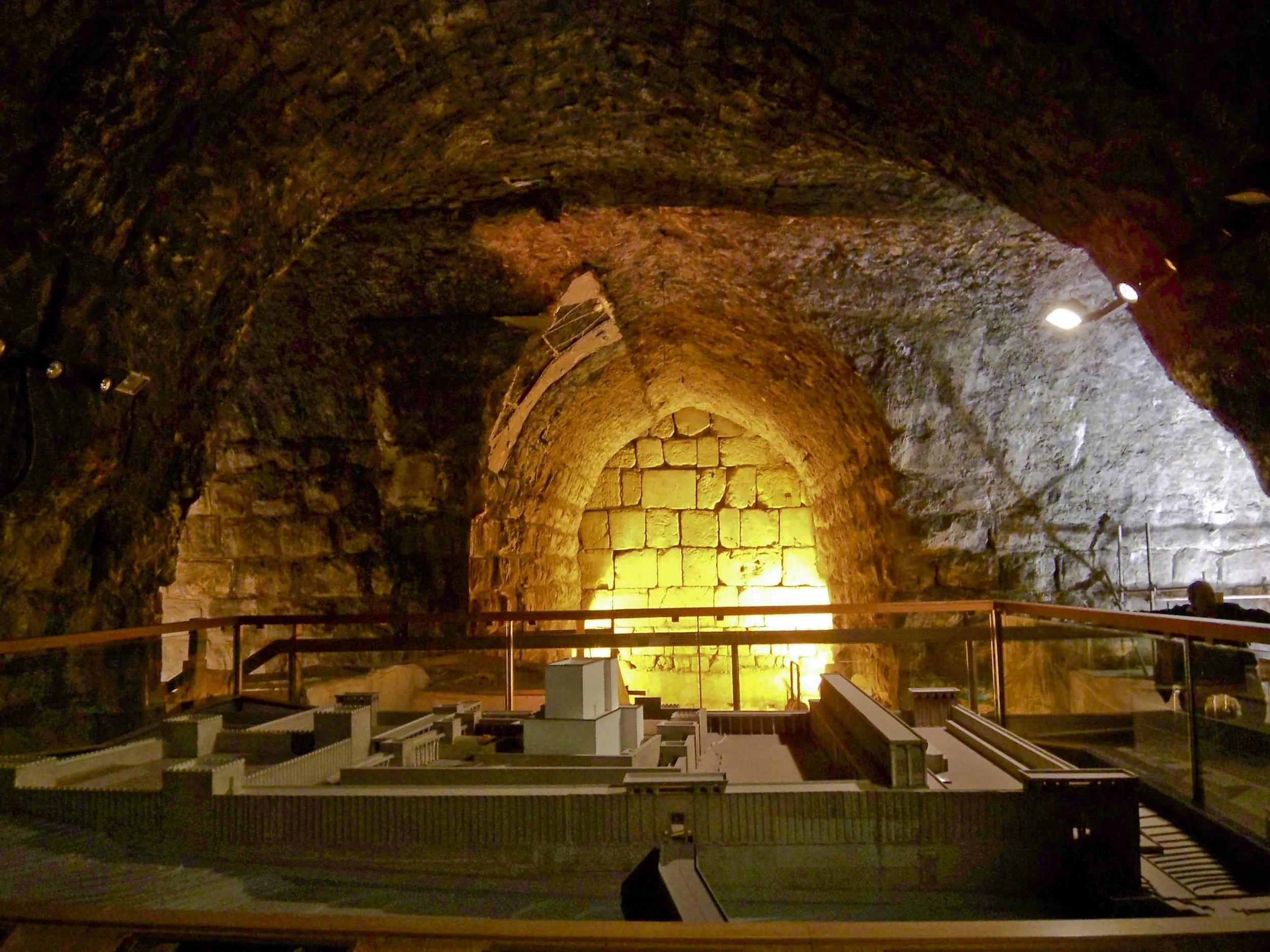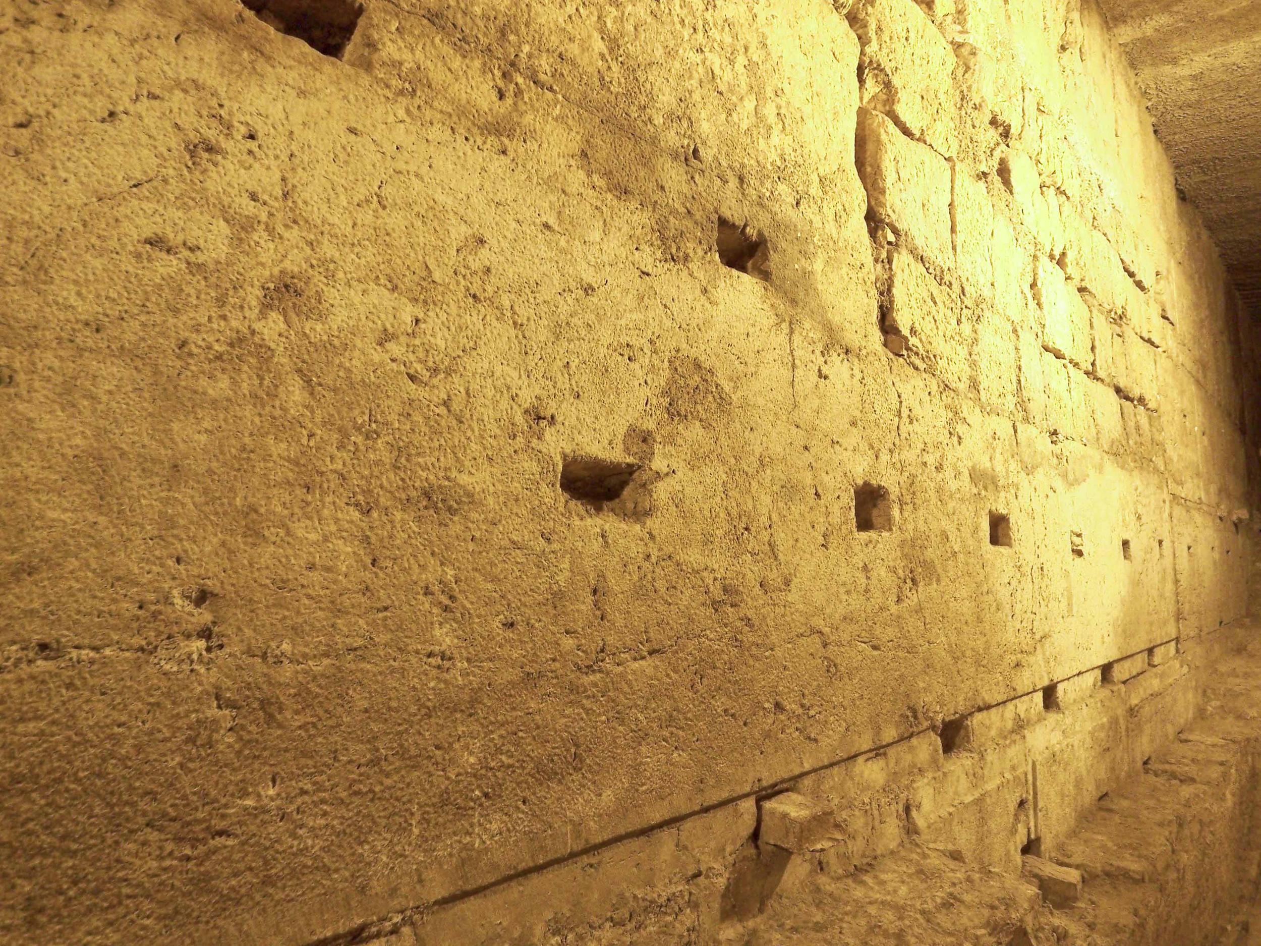 Inside the excavations under the Arab part of Jerusalem, there is much more of the Western Wall to see. It is also possible then to start to appreciate the massive engineering feat Herod undertook, building a wall around the Temple Mount, which levelled the area, with the temple stood on top. There is a useful diorama that helps understand what one is looking at. In the photos, you can see towards the right, the currently exposed part of the wall, compared to the entirety of the incredibly immense wall that is there. Some of the blocks are unbelievably massive. The one in photos 4&5 is thirteen metres long and ways approximately six hundred tonnes. How it got there is a matter for speculation. As can be seen in photo 6 the blocks are all slightly indented as they go up. This was not a structural device, but was actually to make the wall not appear as though it were going to topple for those looking up from below.