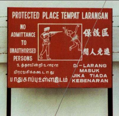 Malaysia is a pleasant country, but when I visited it I don't think I necessarily saw the best it had to offer. It is a bit of a police state and some of the signs are so blunt as to be amusing. I particularly liked the cartoon on this one (photo below) outside a military port. Next to it was a sign that said that anyone taking photos would be shot, I didn't have the time to get a picture of that one.