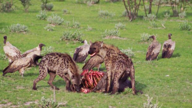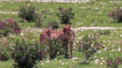 In Etosha National Park I was fortunate enough to see two Cheetahs (photo 1 & 2), judging by their behaviour as they were being harassed by a black backed jackal we surmised they were probably with young cubs. I also saw white rhino, red hartebeest (photo 3), elephants (photo 4), wildebeest / gnu (photo 5), giraffes (photo 6), zebras (photos 7 & 8), as well as seeing nature in the raw when black backed jackals tore apart a zebra (photo 8) and hyenas and vultures devouring a wildebeest (photo 9).