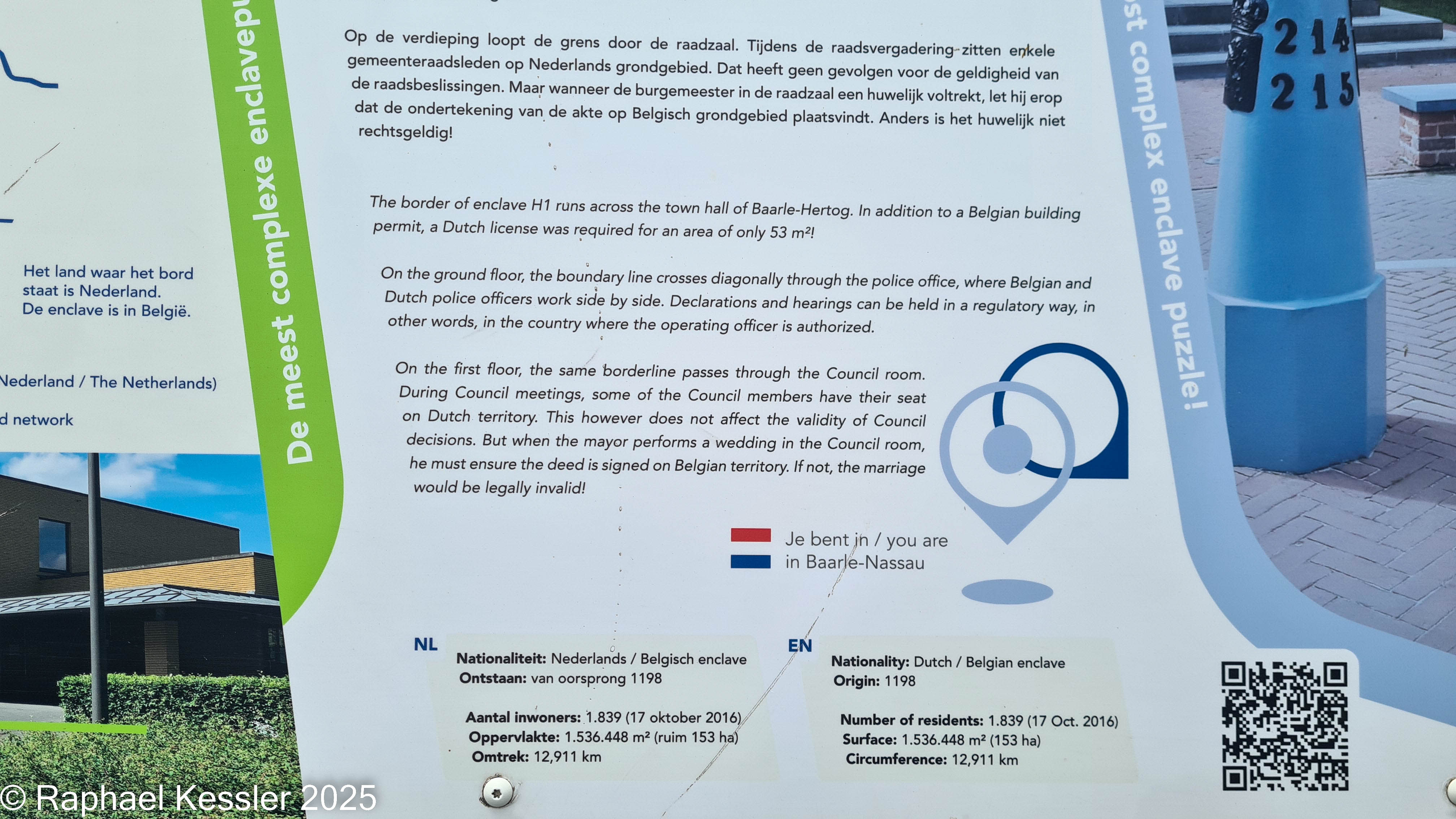 Baarle is a unique village straddling the border between Belgium and the Netherlands, consisting of two municipalities: the Belgian Baarle-Hertog and the Dutch Baarle-Nassau. The border is so complicated that it forms a patchwork of 22 Belgian exclaves (parts of Belgium completely surrounded by the Netherlands) and seven Dutch enclaves within those Belgian exclaves. The two parts of the village have separate town halls, police forces, and mayors, but function as a single community where the nationality of a house is determined by the position of its front door.