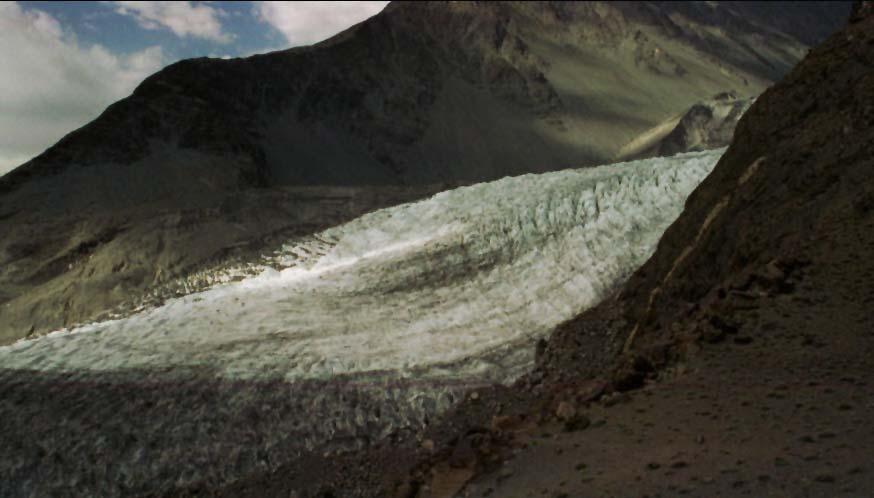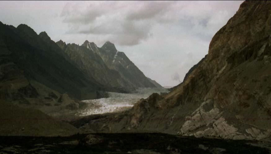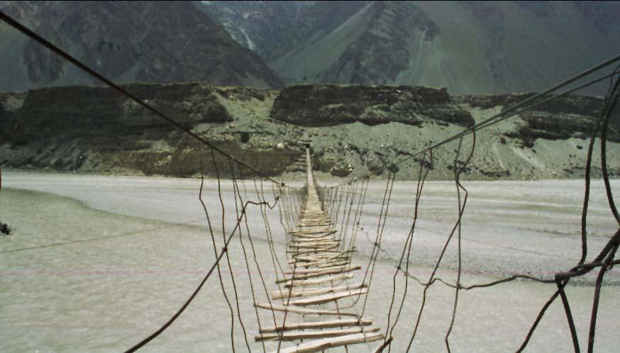 Some of the most spectacular mountains I have seen are in the north of Pakistan. In Passu the Cathedral (photo 1) is an impressive jagged mountain. This area has the highest concentration of over seven thousand metre peaks in the world and is also the region with the highest concentration of glaciers away from the poles. Examples of these are the Batura (photo 2) and Passu (photo 3) glaciers. At some points there are precarious rope bridges spanning wide gorges (photo 4), the wood boards apart from being quite spaced out were often broken and rotten aswell.