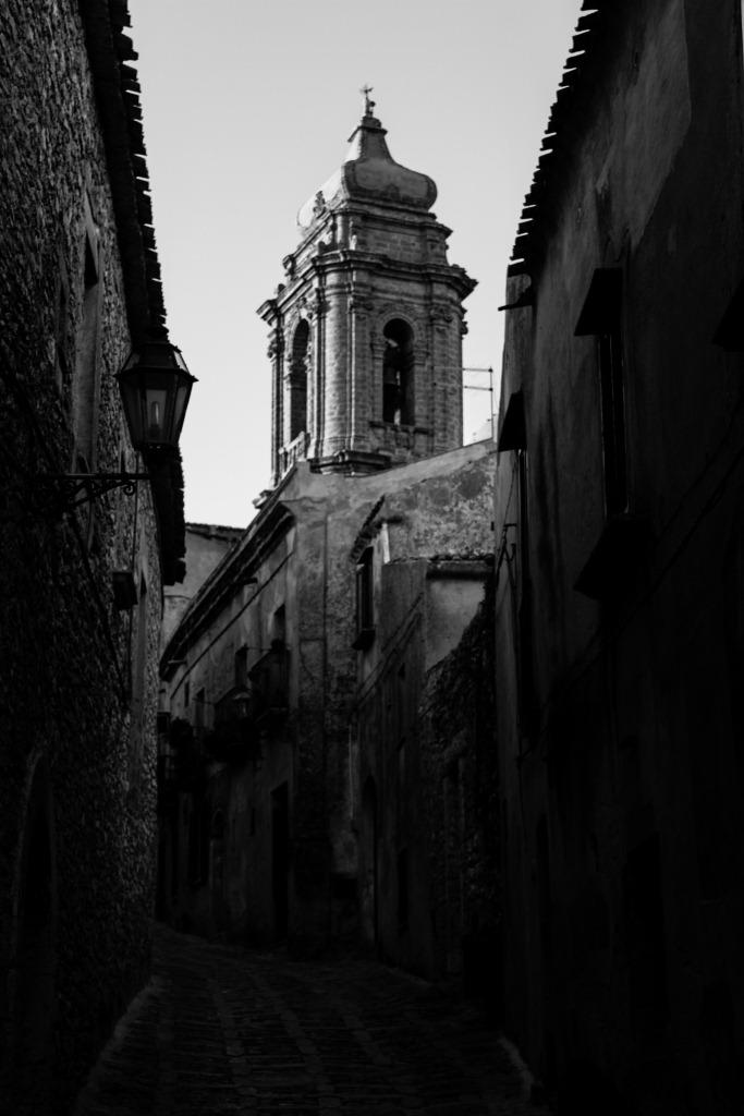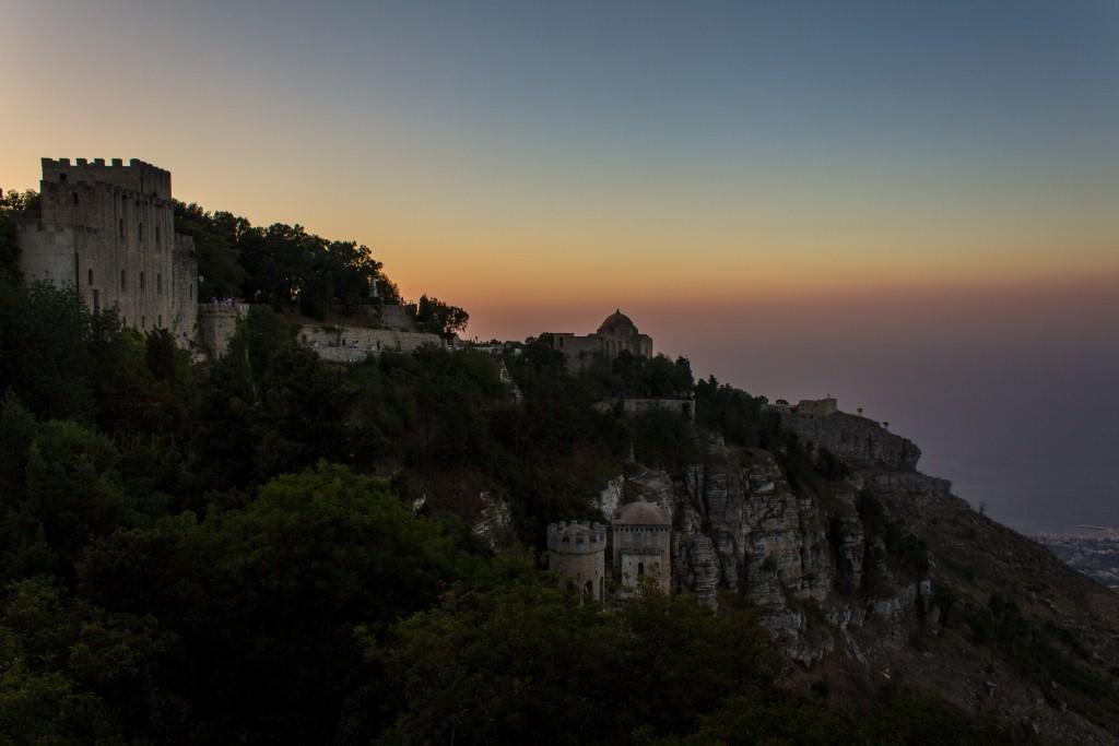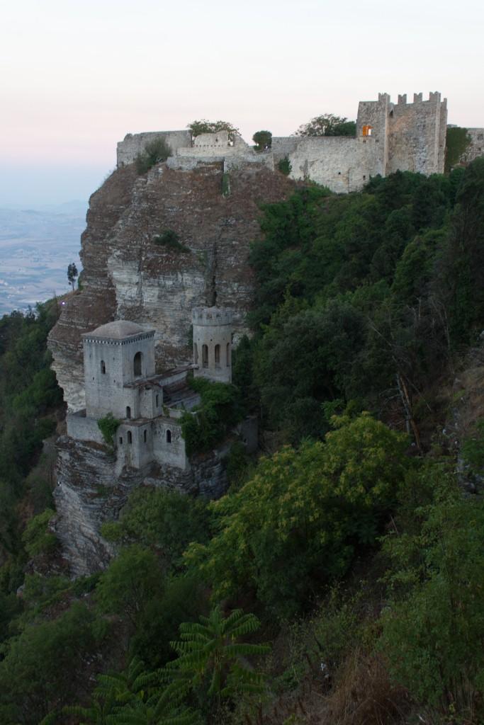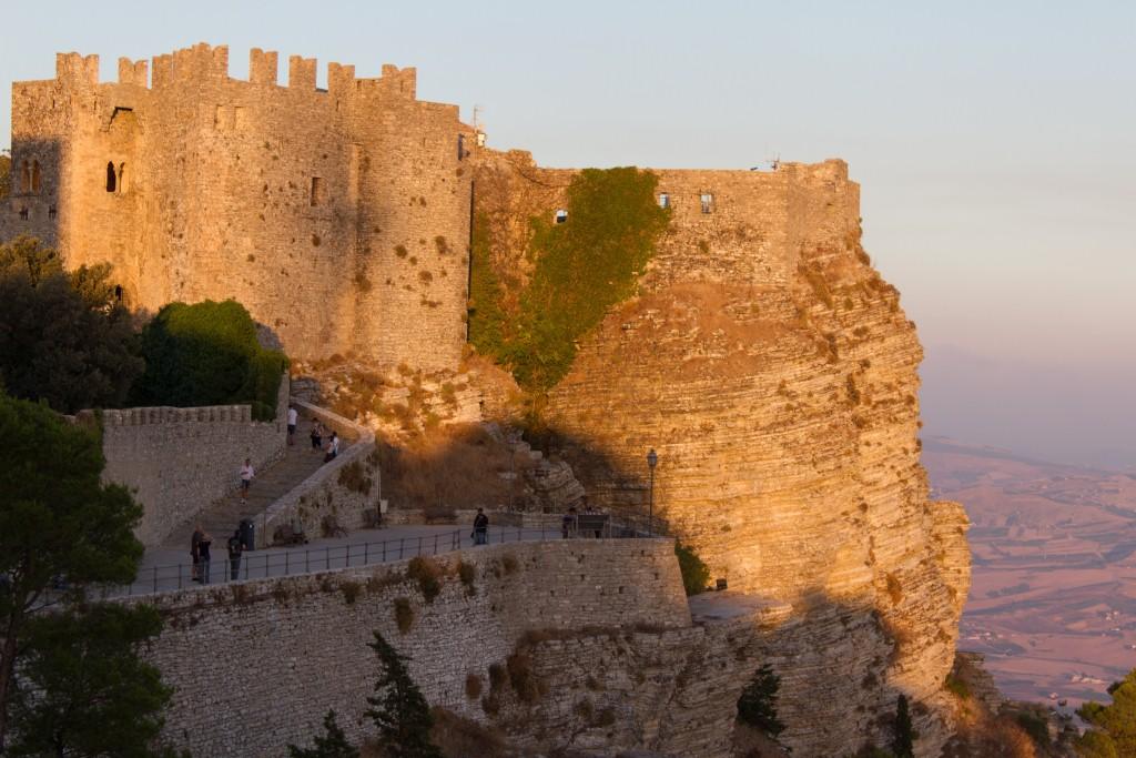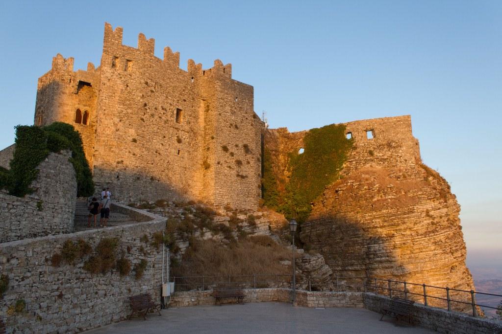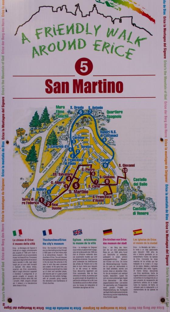 Erice is a picturesque old village perched atop a rock near Trapani. It has a number of churches a castle and confusion about which nationalities speak which language or which their flags are. According to the information, it also has some very slow builders. There are a lot of people sitting around doing nothing but chatting. Perhaps they are the builders.