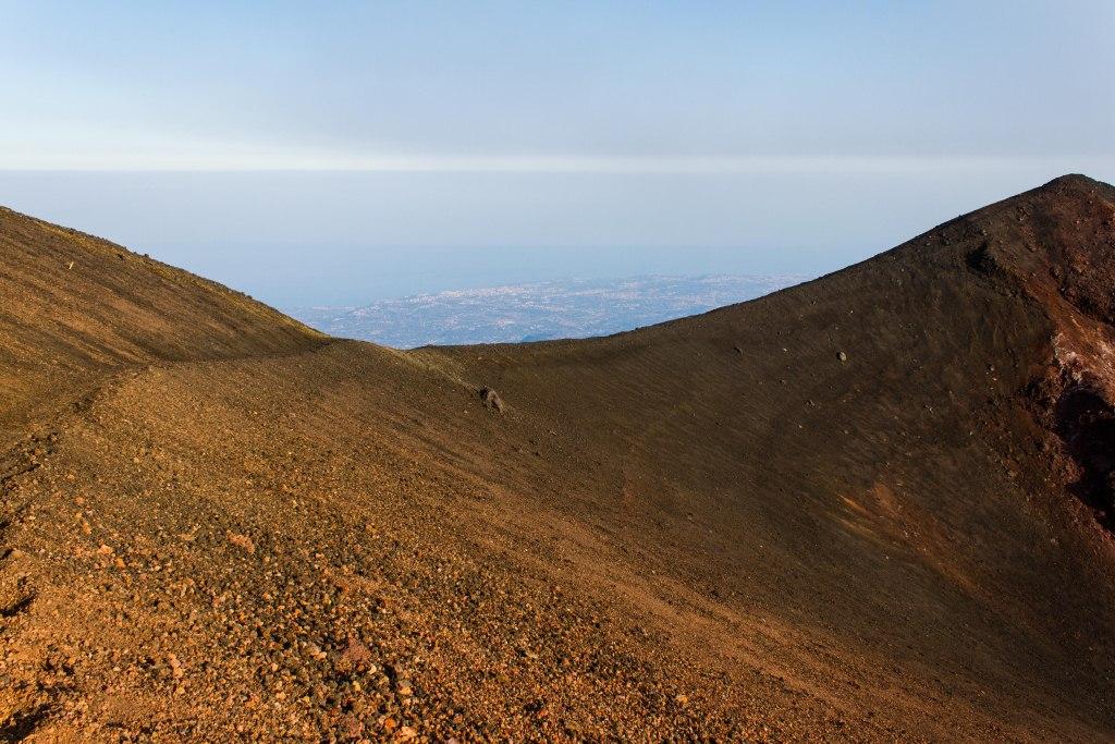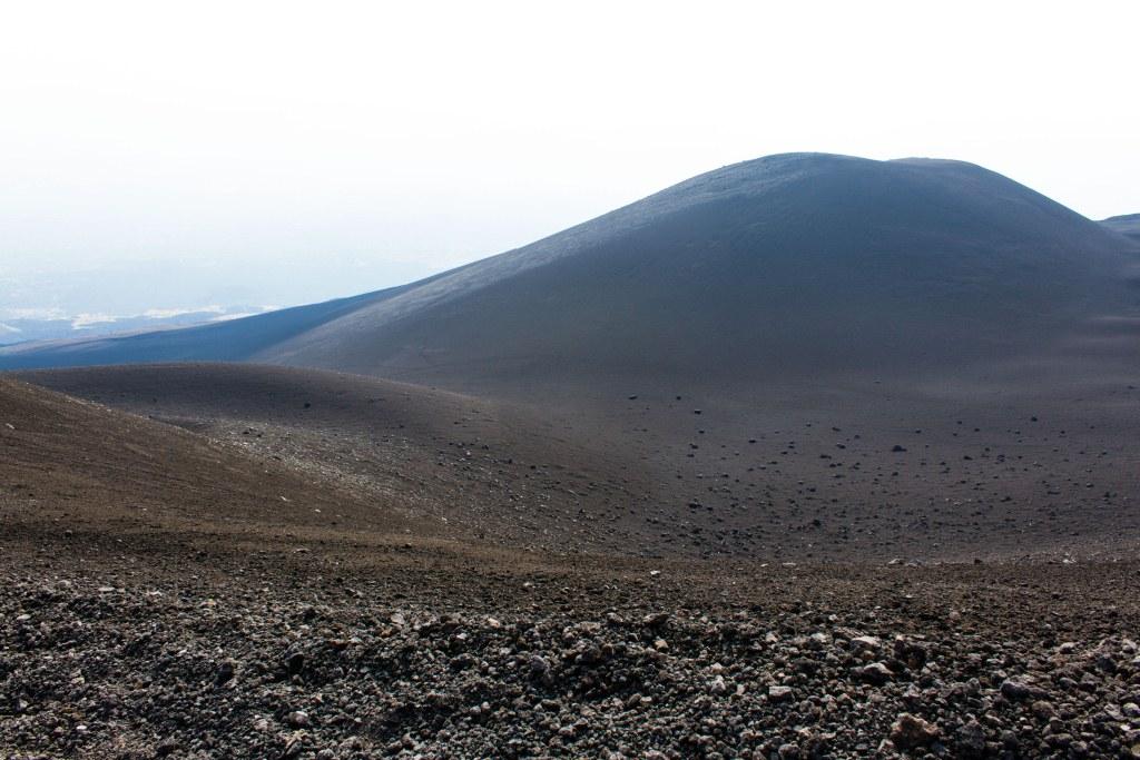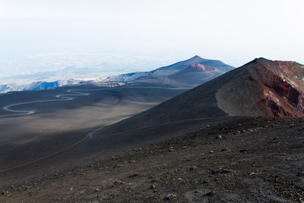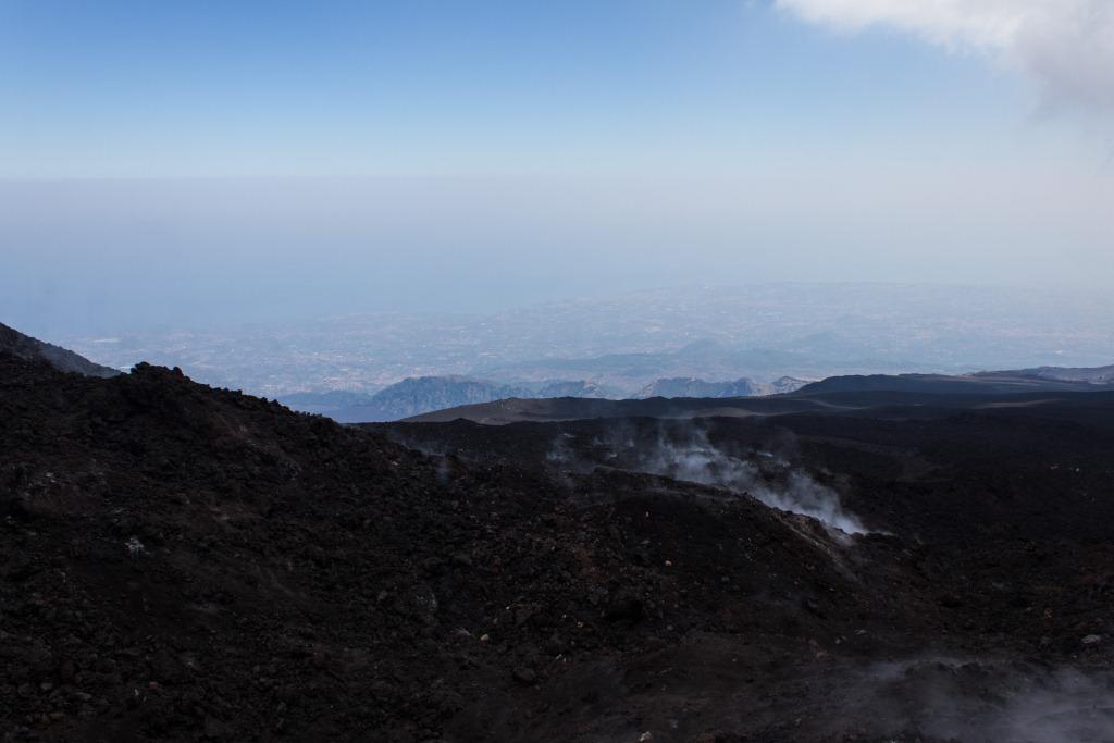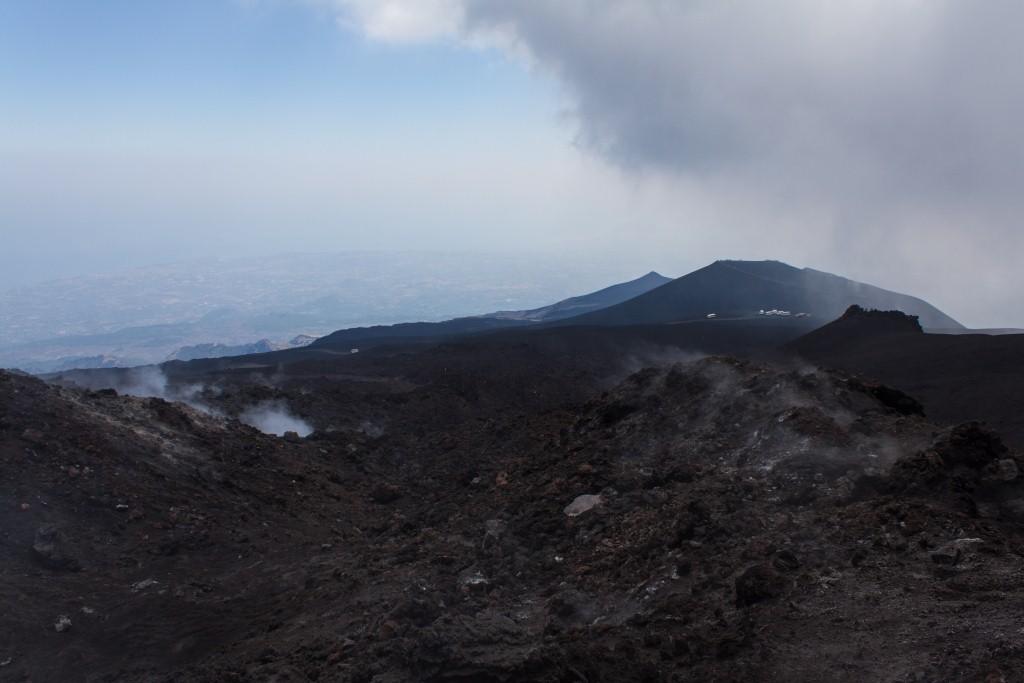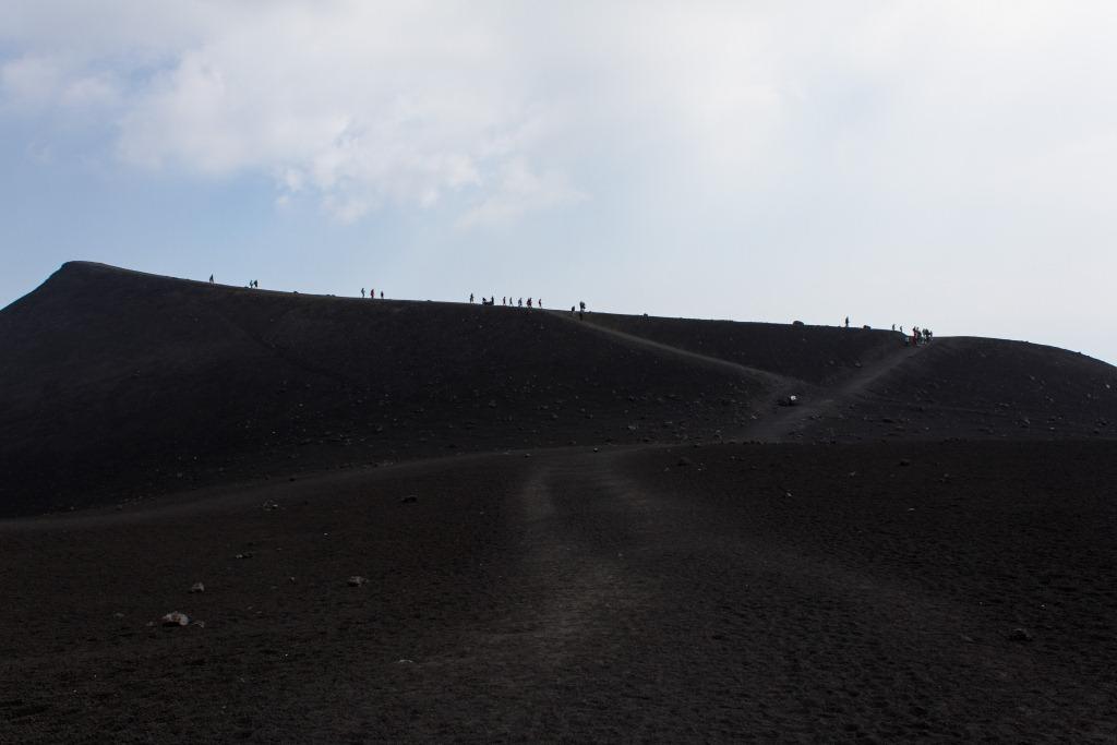 We got the cable car up the main uphill part and then walked the rest (the 4x4 bus was â¬35). It is quite hard going walking up a mountain of soft, loose rock, though allows for pauses and detours that the bus would not have. The views up to the main crater and to some of the other vents were nice en route, as were they downwards across the bay of Catania. Some people coming down the loose rock and ash would leave a plume behind them.