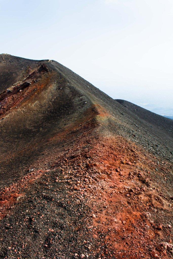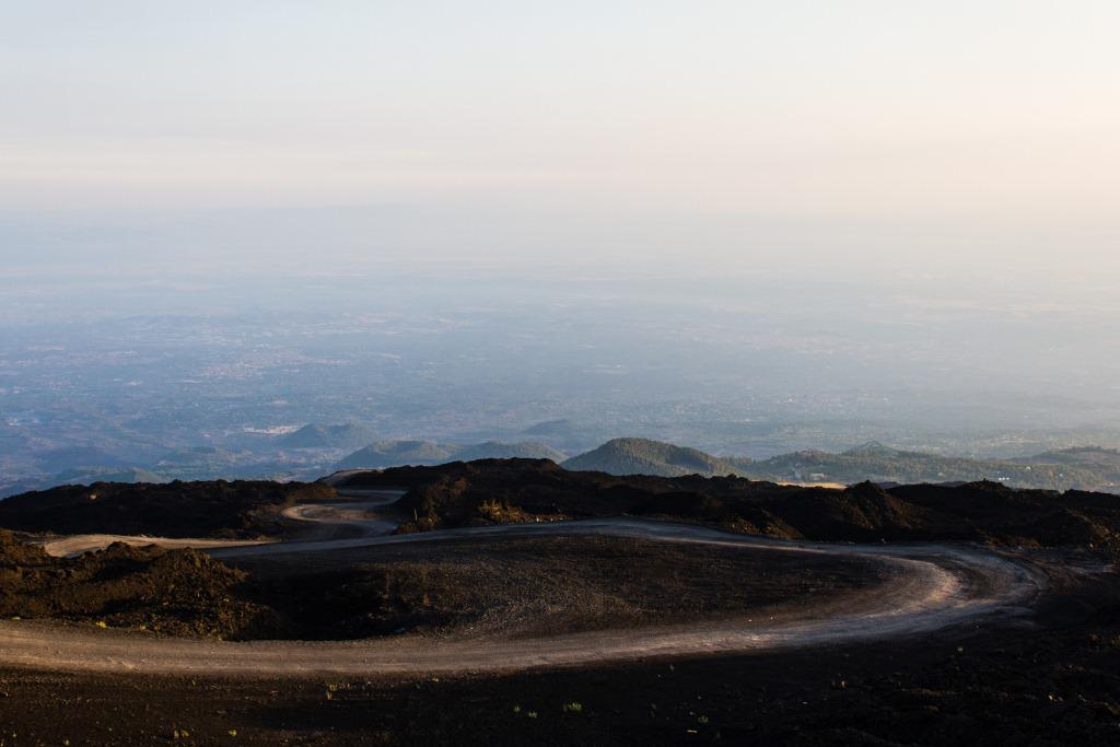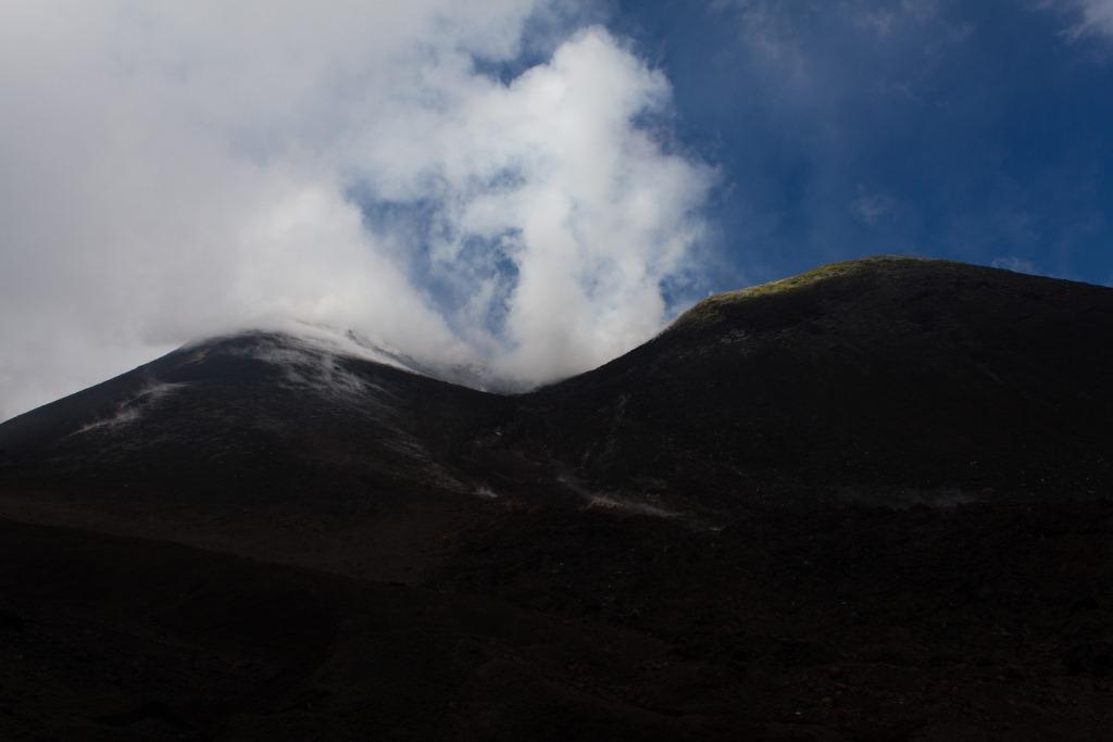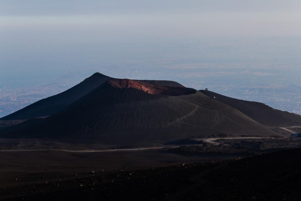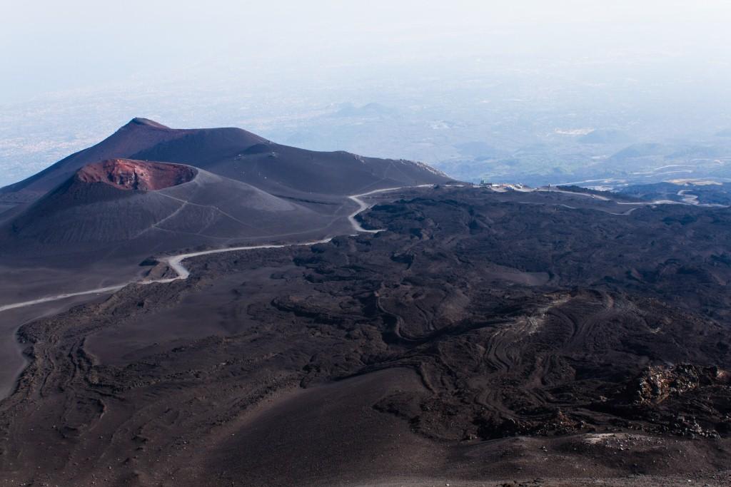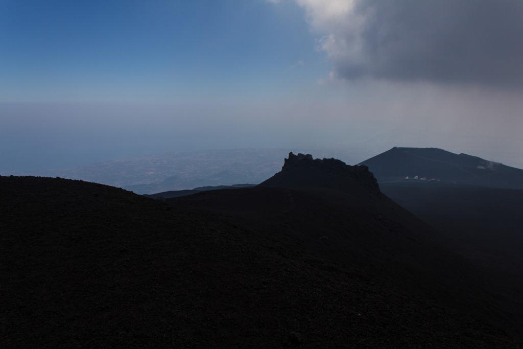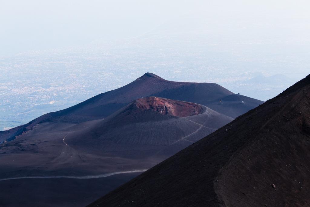 We got the cable car up the main uphill part and then walked the rest (the 4x4 bus was â¬35). It is quite hard going walking up a mountain of soft, loose rock, though allows for pauses and detours that the bus would not have. The views up to the main crater and to some of the other vents were nice en route, as were they downwards across the bay of Catania. Some people coming down the loose rock and ash would leave a plume behind them.