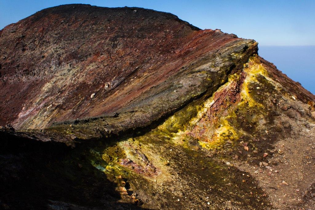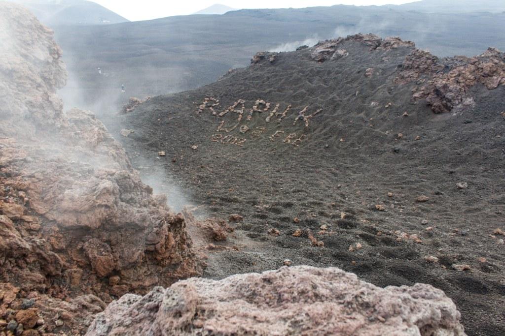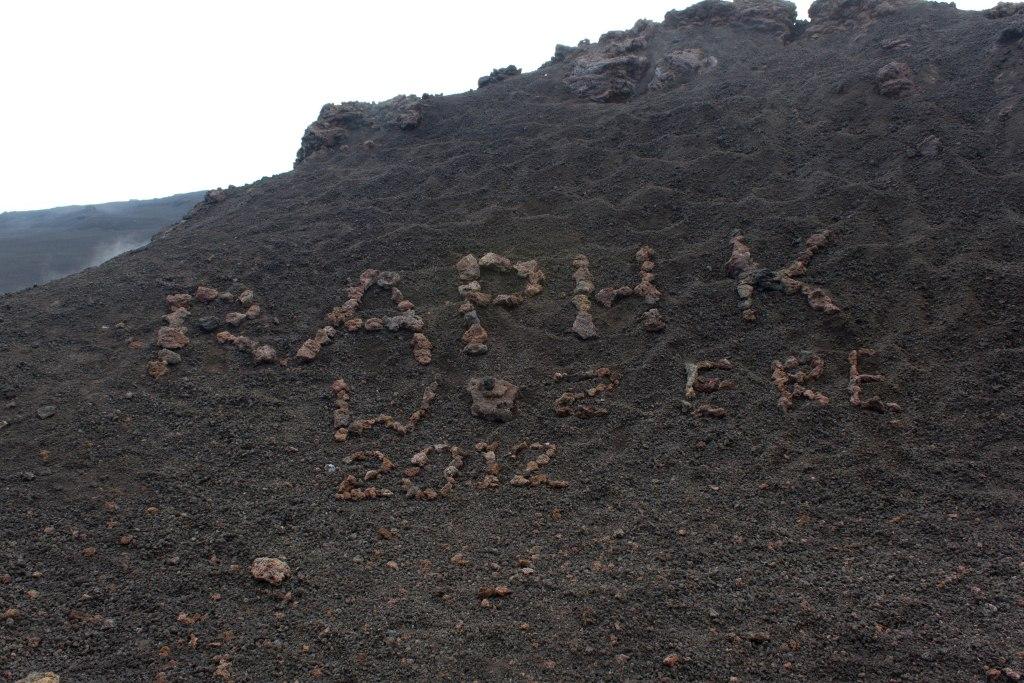Unwittingly, I appeared to encourage dissent from the afore mentioned group who ventured past their guide up the volcano. Though none were quite as foolhardy as I was. One chap from Turin attempted a different route and then came and joined me where we had a chat (in French, as it was the most mutually agreeable lingua franca) about things and recovered a bit. I did some graffiti using rocks (intentionally in a cleft where it would not be in anyone's photos but mine and well above the naughty line, where no-one should have been anyway) and went to explore some more craters.