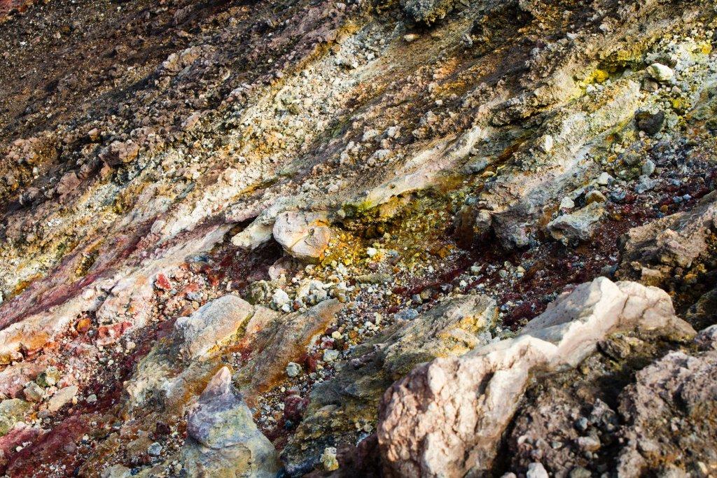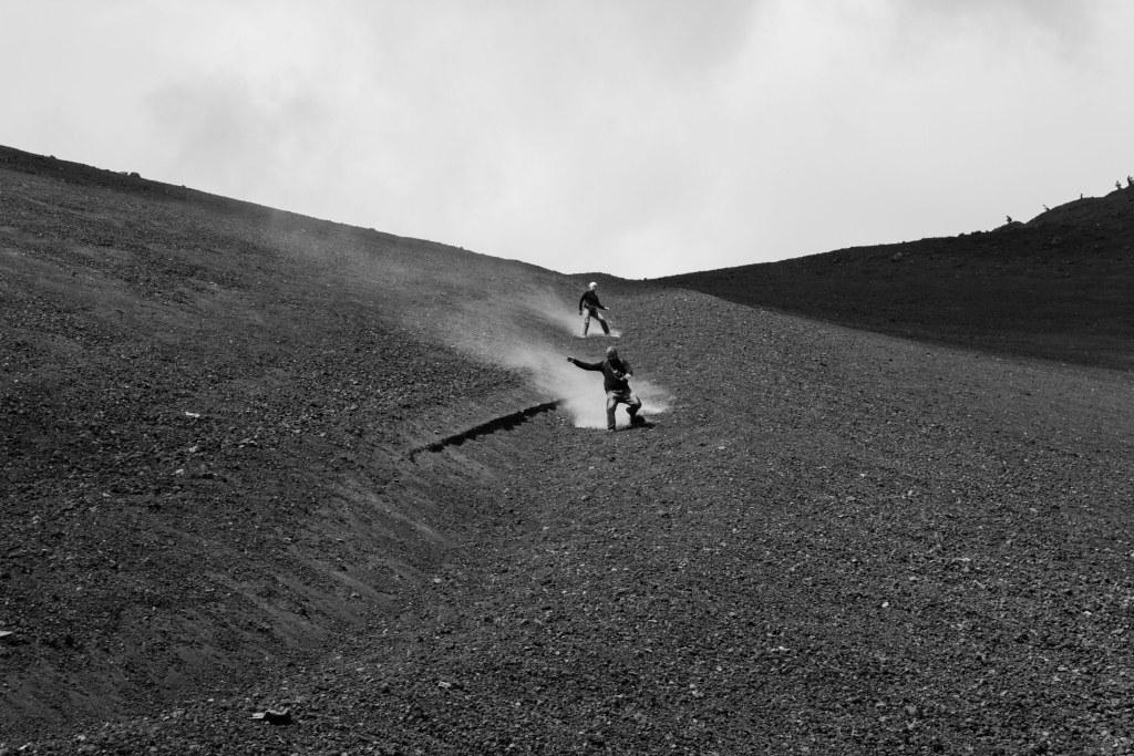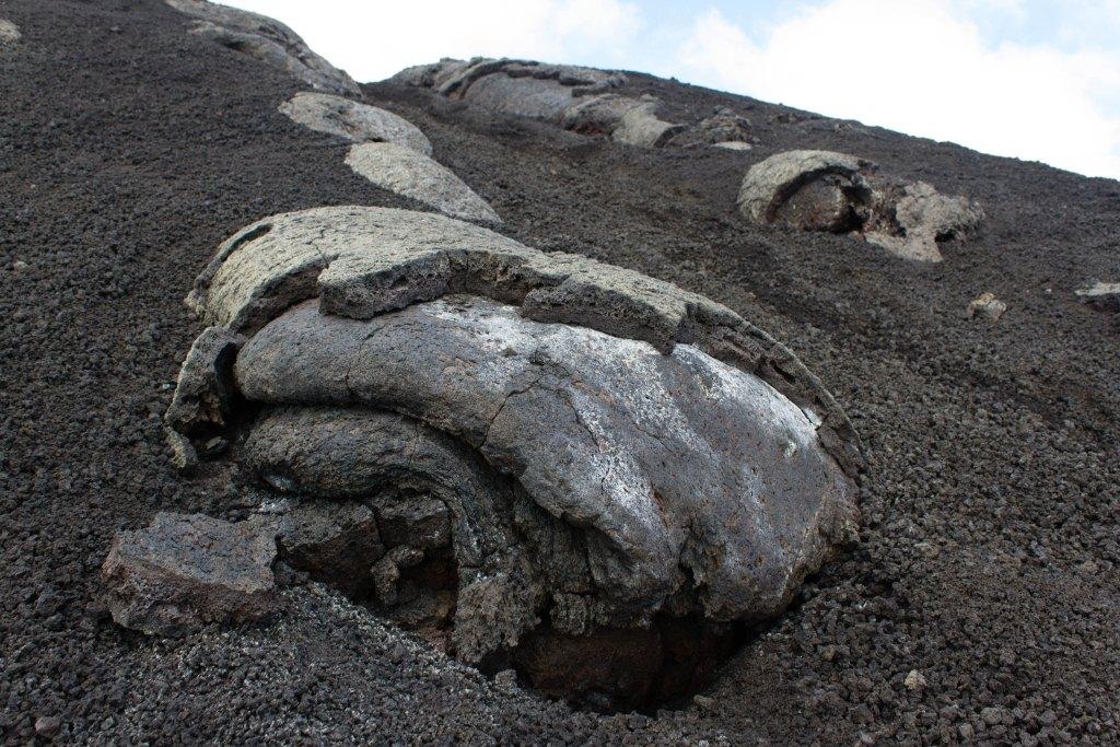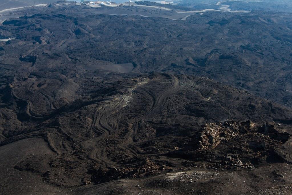 The upper part of the volcano is grey and desolate, though there are some streaks of colour around some of the craters - red - iron, white - calcium, green - copper, blue - aluminium, yellow - sulphur. There was a rock formation that to me either looks like a pair dancing or some conjoined twins wearing a tux. One part around the back of a crater, along a precipitous path looked like a flesh wound in the side of the mountain. Some of the views across the lavafield, show what the flow from the volcano encompasses.