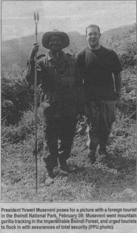 When I was in Bwindi Impenetrable Forest to see the Gorillas, the President, Yoweri Museveni was also there in order to promote tourism and show how safe it now was (this was a year after what became known as the Bwindi incident occurred, when nineteen tourists and their guides were massacred by Congolese rebels). As I was the only tourist around at the time I joined his group and had a nice time chatting with him (photo 1) and watching how he interacted with the locals. We posed together for a few pictures (photo 2) and then after having some lunch back at camp, parted company when he flew back to Kampala. A few days later I was surprised to see me and the President on the front page of the national newspaper (photo 3).